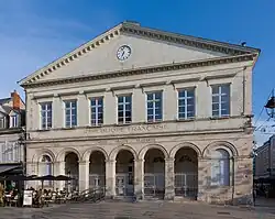 Following the French Revolution, the new council decided to commission a dedicated town hall. The site they selected was on the south side of the market square (now Place Robert Monestier) facing the market hall. The new building was designed by Pierre Murison in the neoclassical style, built in ashlar stone and was completed in 1828. The design involved a symmetrical main frontage of seven bays facing onto the market square. The central five bays were arcaded with round headed openings, formed by square columns supporting imposts and moulded surrounds. The outer bays contained raised openings for the delivery of goods. The first floor was fenestrated by seven casement windows with cornices and, at roof level, there was a modillioned pediment with a clock in the tympanum.[3]