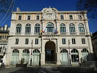 The Hôtel de Ville (French pronunciation: [otɛl vil], City Hall) is a municipal building in Pau, Pyrénées-Atlantiques, western France, standing on Place Royale. It was originally commissioned as a theatre, but was later remodeled internally to serve as a town hall as well. It was designated a monument historique by the French government in 2017.[1]