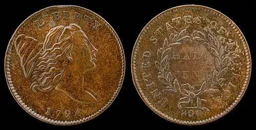 There are no mint marks on any of the coins (all minted at the Philadelphia Mint) and the edges are plain on most half cents. On the 1793, 1794, and some 1795 coins and a variety of the 1797 coin, it was lettered TWO HUNDRED FOR A DOLLAR and another 1797 variety had a gripped, or milled, edge.