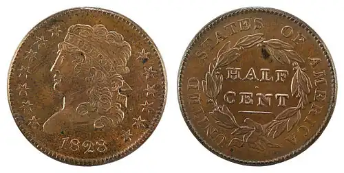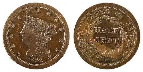 The half cent was the smallest denomination of United States coin ever minted. It was first minted in 1793 and last minted in 1857. In that time, it had purchasing power equivalent to between 12¢ and 17¢ in 2024 values.[1] It was minted with five different designs.