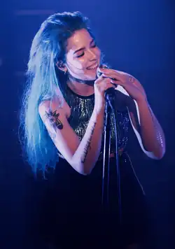 In her early career, Halsey drew criticism for allegedly calling herself "tri-bi" in an interview, due to her being biracial, bipolar, and bisexual. In a 2016 interview with Rolling Stone, she criticized the label as a trivializing way to describe her.[217] Halsey became most known for her signature dyed blue hair in her early career.[218] She sparked controversy in 2016 after several fan interactions, some involving the artist kissing underage fans.[219]