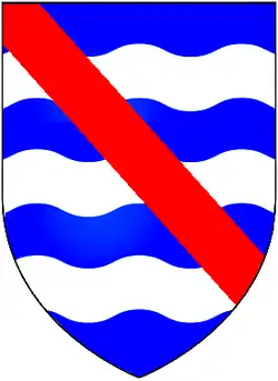Arms of Halswell: Azure, three bars wavy argent over all a bend gules