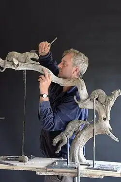 Hamish Mackie (born October 1973) is a British wildlife sculptor who works in bronze, silver and any other castable metal using the lost-wax casting method. He is considered to be one of the world's foremost wildlife sculptors.[1] Largely self-taught, Mackie captures his subjects - ranging from livestock to birds via wild animals - by observation in a natural environment, taking detailed photographs and sometimes modelling in plasticine. From this he creates a highly accurate anatomical core covered with a loose, almost impressionistic skin that captures the essence of the animal's personality. He has won numerous commissions including works for Jilly Cooper, Charles Saatchi, Ronnie Wood (private) and RSPCA, National Trust, Woburn Abbey, Merrill Lynch, Hiscox and most recently the Berkeley Group Holdings (public).[2] He has travelled to places including Antarctica, the Falkland Islands, Australia, across Africa, and the United Arab Emirates in search of subjects.[3]