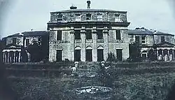 Trinder describes the design as comprising "a large, Palladian central block (corps de logis) accentuated by a giant order of shallow pilasters flanked by low arcaded wings terminated in tetrastyle porticoes, while an asymmetric service wing stretches toward the northeast, hidden behind the bulk of the house."[9] Coadeware plaques of scenes derived from the Borghese Vase adorn both porticos, and the influence of the temples at Paestum, which Latrobe may have witnessed on during prior visit to Naples, and Delos has been noted by scholars.[9][10][11][12] Nikolaus Pevsner also observed that the columns were "patently inspired by the then very recent work of such men as Ledoux and Brongniart".[1]