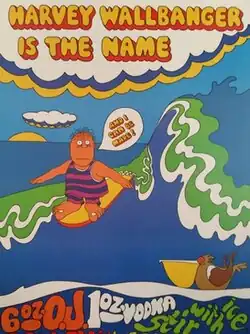 The Harvey Wallbanger was created in 1969 as a marketing campaign by McKesson Imports Company, importer of Galliano, as a means of promoting Galliano. The campaign was headed by George Bednar, marketing director of McKesson, and a cartoon character was commissioned from graphic artist William J. "Bill" Young in Lima, New York,[1][2] with the tagline that Bednar claimed to have penned: "Harvey Wallbanger is the name. And I can be made!"[3][4][5] The Harvey Wallbanger character was a surfer, appearing in various advertisements during the campaign, and was mentioned in print as early as 1969,[3] continuing into the 1970s.[6][7] The recipe displayed in the advertisements is: "6 oz. O.J., 1 oz. vodka, stir with ice, splash in 1⁄2 oz. Galliano".[1]