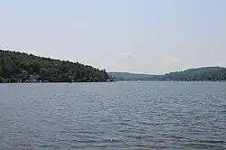 Harveys Lake (also known as Harvey Lake or Harvey's Lake[1]) is a natural lake in Luzerne County, Pennsylvania. It has a surface area of approximately 621.5 acres (251.5 ha), or nearly a square mile. The lake is situated entirely within the borough of Harveys Lake.[2][3] By volume, it is the largest natural lake in Pennsylvania, and by surface area, is the second-largest lake. It is a glacial lake surrounded by hills and is the source of Harveys Creek, a tributary of the Susquehanna River. The lake has a stone masonry dam. The lake's watershed has an area of approximately 3600 acres. The majority of the watershed is forested, but there is some developed land as well. Nearly all of the developed land is close to the lake itself, and the lake is surrounded entirely by a paved road.