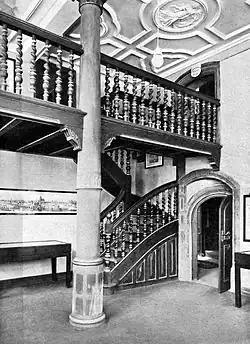 The vestibule originally served the Alte Hölle's staircase, which revealed the very old style of construction: once, the vestibule was open towards the yard and arbor-like vestibules with wooden parapets were located in front of the upper rooms. This construction method was common for timber-framed houses in Frankfurt's historic center, even in the early 20th century. However, as part of the construction of the Goldene Waage, Hamel had ceilings installed in the vestibule and thus created further rooms above it. Since the rooms were considerably shorter than the original rooms of the Alte Hölle and also were not at the same height as the rooms of the Goldene Waage, as can be seen in the cross-section of the house, a tower containing a spiral staircase was constructed between the two buildings. On the ground floor the staircase was accessible via a wooden door in the northern wall of the yard opening to Hell's Lane.