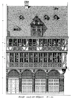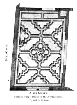 Above the ground floor there were two cantilevering half-timber framed floors, their gable side facing the market with two gable floors above. However, in comparison to the first floor the second floor protruded only on the side facing the market. The eastern side, facing the cathedral, displayed a very delicate design of the timber framing, which formed a pattern of saltires. The timber framing could be compared to the design at Schwarzer Stern, which had been built at Römerberg shortly before. In contrast to the Goldene Waage the Schwarzer Stern was rebuilt in the 1980s after its destruction in World War II. The timber frame of the upper floors also showed almost continuous rows of narrow windows on all sides. On the first floor there were eleven windows to the eastern side, six to the northern. On the second floor there were twelve windows to the eastern and four to the northern side. The glazing was completed around 1750.[5]