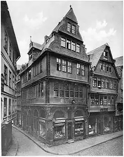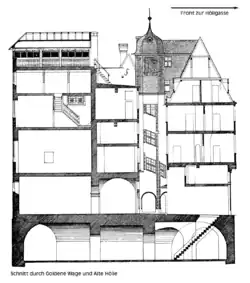 The corner house Goldene Waage, as well as the Alte Hölle was bought by Andreas Gaßmann for 3,040 and 2,000 Guilders respectively in 1588. The confectioner and spice trader Abraham van Hamel bought the buildings from Maria Margarethe Gaßmann in 1605. Hamel came from Tournai in the Spanish Netherlands. As a member of the Continental Reformed Church and a religious refugee he travelled through Sittard near Aachen and Wesel in 1599 and arrived in Frankfurt, where his father and brother had already taken up citizenship. Despite some opposition from the guilds he was permitted to take the citizen's oath on 19 November 1599.[5]