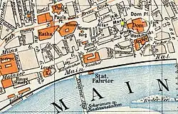 The house on the corner of Höllgasse was mentioned as early as the Middle Ages, in 1323, known as House Kulmann or Colmann after the owner.[4] In 1405, it became one building with the house behind it, the Alte Hölle (Old Hell). Around this time the name Höllgasse (Hell's Lane) emerged, which described the densely built and extremely dark lane between the market square and Bendergasse, which was very narrow even for medieval times. There was also a house called Junge Hölle (Young Hell), located on the eastern side of Höllgasse, directly opposite Alte Hölle (Old Hell). Most of the houses on this side of the street were built with overhangs, which meant the first floor was on the property of the cathedral – much to the annoyance of the cathedral administration. The first legal case was recorded in 1299, when the goldsmith Colmann came into conflict with the clergy because his house was located on the eastern side of Höllgasse.[5]