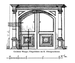 Judging by its outward appearance, the Goldene Waage appeared to be a typical renaissance building in Frankfurt's historic city center: a tall foundation made of red sandstone that outwardly showed intricate, richly decorated arcades – four of which pointed towards Hell's Lane (Höllgasse), two towards the market. The arcades were based on widely overhanging imposts; the keystones depicted lions' heads. The front door, which was decorated by a double lintel, was located between the two arcades facing the market. While the upper one was connected to the (extended) column shafts of the arcades, the lower formed almost a straight line. Its keystone displayed the coat-of-arms of Abraham van Hamel and his wife Anna van Lith (as can be seen in the photograph). The arms of alliance coat-of-arms consisted of two men's shields directly next to each other. The right-hand shield displayed a vertical arrow with a barbed hook and three horizontal lines over the shaft. The arrow ended between two ovals, which formed the letter A(braham) with their curves and one linking line. The letters V(on) and H(amel) could be seen in the ovals themselves. The left shield displayed three stoat's tails in the lower two-thirds and the letters A(nna) V(an) L(ith) in the upper area. The helmet crest was a guardian ram (German: Hammel), undoubtedly a reference to the name of the builder.