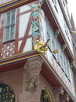 The crossing pier, which was statically important for the timber frame, was entirely decorated with grand carvings (as can be seen in the image): Patriarch Abraham was depicted on the bottom alongside a ram with golden scales above. At the bottom of the girder a metal arm was attached to the building, holding golden scales. The name of the house seems to be derived from this object. The arm was located above the front door until 1899 and originates from the times when houses needed a clear, visual identifier due to the lack of house numbering. The scales that had been attached after the renovation was a detailed replica, while the original, which was exposed to the weather for nearly 400 years, was exhibited in the Museum for City History within the house.