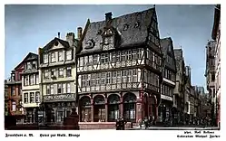 The Haus zur Goldenen Waage is a medieval half-timbered house in the old town of Frankfurt am Main, which was destroyed in the air raid on 22 March 1944. Because of its high architectural and historic value, it is one of the most famous sights of the city. It is situated in front of the main entrance of the cathedral on the corner of the narrow Höllgasse, which leads from the cathedral square to the Römerberg and Altstadtgasse.