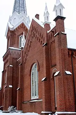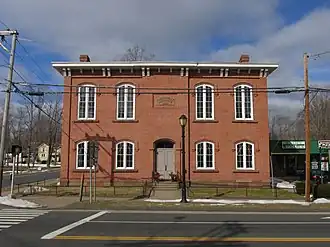 The historic district encompasses a section of Hazard Avenue (Connecticut Route 190 and adjacent roads, as well as a now-parklike section of the banks of the Scantic River, where the operations of the Hazard Powder Company were located. The district is dominated by four public buildings constructed of brick with brownstone trim: a public school, the Hazardville Institute, the former St. Mary's Episcopal Church, now incorporated as Holy Trinity Episcopal Church,[3] and the Hazardville United Methodist Church.[2]: 33–34  The school and the institute are both of Italian Renaissance Revival design and were built in 1864 and 1869, respectively. The Episcopal church is a Gothic Revival structure built in 1863. The Methodist church, built in 1872, is in the Romanesque Revival style.[2]: 29