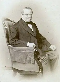 In 1848 he received an appointment in the Prussian ministry for foreign affairs, and in 1853, he was promoted to be privy councillor of legation (Geheimer Legationsrath).[2] Abeken remained in charge for more than twenty years of Prussian politics, assisting Otto Theodor Freiherr von Manteuffel and Chancellor Otto von Bismarck. The latter was so much pleased with Abeken's work that officials started to call Abeken "the quill [i.e., the scribe] of Bismarck." Abeken married again in 1866; his second wife was Hedwig von Olfers, daughter of the general director of the royal museums, Privy Councilor von Olfers.