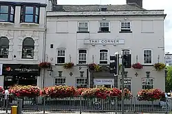 The shop on the left is a charity shop of Helen & Douglas House, next to the Thai Corner restaurant on the corner of West Street and Friar Street in Reading