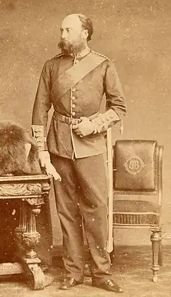 His military career began in 1855 when he became an ensign in the Rifle Brigade, serving in the Crimean War and then moving to Canada during the Trent Affair. He subsequently transferred to the Grenadier Guards.[2] Between 1870 and 1871 he served as Aide-de-Camp to His Serene Highness Prince Edward of Saxe-Weimar, and afterwards becoming Assistant Adjutant-General of the Home District at the Horse Guards in 1877.[3] He received the brevet of Colonel 1 April 1881, and in 1884-5 served with the Nile Expedition, for the relief of General Gordon, on the Staff as Inspecting Officer of the Lines of Communication, and afterwards as Commandant at Dongola, for his services being mentioned in Despatches and receiving the medal, with clasp and the Khedive's Star. He was admitted to the Military Division of the Most Honourable Order of the Bath in 1887[4] and retired 24 June 1889.