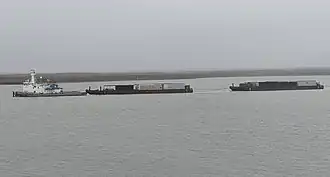 Like other pusher tugs, she has a tower, with a steering bridge, that rises high above her conventional bridge, to help navigate, when she is pushing a line of barges.[2] She displaces 783 tons, and has a draft of just one metre.[3] Her four propellers are mounted in tubes.[5] Each is powered by an 839-horsepower diesel engine.[6]