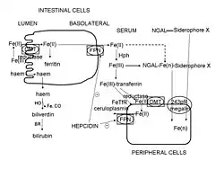 - ^ Gulec S, Anderson GJ, Collins JF (August 2014). "Mechanistic and regulatory aspects of intestinal iron absorption". American Journal of Physiology. Gastrointestinal and Liver Physiology. 307 (4): G397 – G409. doi:10.1152/ajpgi.00348.2013. PMC 4137115. PMID 24994858.