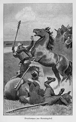 Hestavíg was an entertainment activity during the Viking Age in the Icelandic Commonwealth (930–1262), presumably a sport consisting of a brutal and bloody confrontation between two stallions, egged on by their masters, which mainly served to choose the best specimens for breeding.[1] It was a cultural event of great importance and sometimes led to verbal and physical confrontations among the spectators. The triumph of a champion or the other could have social and political impact due to the pacts and alliances between goði (chieftains) and bóndi (homesteaders), as testified in the Norse sagas.[2] The site where these battles were held was a neutral place used to strengthen friendship or address issues among rivals. It was also an opportunity for courtship between young couples.[3] Sometimes rivalries raised among participants ended in bloody conflicts.[4] Some examples appear in the Njáls saga (chapter 59) and Víga-Glúms saga (chapters 13-14).[5]