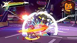 Hi-Fi Rush is a rhythm-action game where the protagonist Chai, his enemies, and parts of the environment move to the beat. Attacking on rhythm is not required, as actions automatically sync up with the music, but by timing the button presses right the players are rewarded with higher damage output and timing-based combo finishers deal additional damage. A parry move allows players to cancel enemy attacks by pressing the button at the exact moment of attacks. In addition to the beat-em-up action mechanics, there are also rhythm-based minigame elements where players repeat cues in a call-and-response fashion, or press buttons in rhythmic sequence based on on-screen cues.[7]