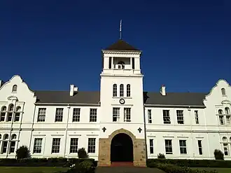 Shortly after Ellis' retirement the position of headmaster was taken over by George Weeks. However he too resigned that year and another new headmaster was needed. The position was awarded to William Falcon in 1906.[9] Under his headmastership Hilton College grew from 50 pupils to over 200. Many buildings were completed such as the William Campbell building and the school chapel. The original school buildings, which were red brick, were changed to the present Cape Dutch style. The present school uniform was introduced along with the house system (the first three houses being Newnham, Ellis and Weeks (later renamed Pearce).[10] Falcon also lead reforms in the school's academic curriculum and, foreseeing the inevitable union of the South African colonies, replaced French with Dutch as the official second language in 1907.