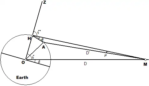 Like others before and after him, he also noticed that the Moon has a noticeable parallax, i.e., that it appears displaced from its calculated position (compared to the Sun or stars), and the difference is greater when closer to the horizon. He knew that this is because in the then-current models the Moon circles the center of the Earth, but the observer is at the surface—the Moon, Earth and observer form a triangle with a sharp angle that changes all the time. From the size of this parallax, the distance of the Moon as measured in Earth radii can be determined. For the Sun however, there was no observable parallax (we now know that it is about 8.8", several times smaller than the resolution of the unaided eye).