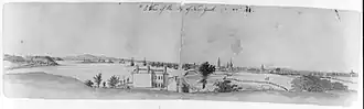 New York City, as seen from Brooklyn in the 1770s. Trinity Church on Wall Street is visible in the distance.