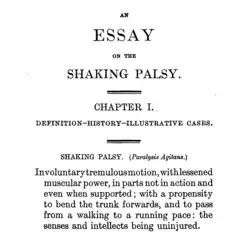 In 1817, James Parkinson published his essay reporting six cases of what he called paralysis agitans.[2] An Essay on the Shaking Palsy described the characteristic resting tremor, abnormal posture and gait, paralysis and diminished muscle strength, and the way that the disease progresses over time.[2][9] He also acknowledged the contributions of many of the previously mentioned authors to the understanding of PD.[2] Although the article was later considered the seminal work on the disease, it received little attention over the forty years that followed.[9] Furthermore, the term paralysis agitans was at times applied to any condition with a loss of motor activity accompanied by seizures. Indeed, the term 'paralysis' alone included both motor and sensory deficits.[10] Noting this, William Sanders proposed in 1865 that the term Parkinsons Disease be used for the onset of symptoms in older people; it had been variously designated paralysis agitans festinia, - senilis or parkinsonii.[11]