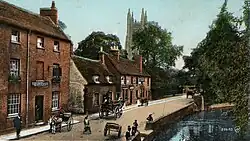 About 1130 a weekly market on Thursdays was authorised to be held in St Neots,[19] as well as four fairs annually. The St Neots market is said to be one of four early "plantation" markets, in effect new towns.[20] This brought further income to the Priory. The market was held on a site very close to the present-day market square, immediately south of the Priory. In a further development, a wooden bridge was built in 1180, at the location of the present-day bridge; tolls were collected by the Priory. There had long been river-crossings -- probably fords, or ferries -- at Coneygeare and Crosshall, and these now fell into disuse. The Crosshall ford was further north than the present-day bridge: Crosshall Road from the junction with the Great North Road may have been constructed so as to aim in a straight line for the Priory and the ford. The existence of the market, and the visits of pilgrims to Neot's relics, encouraged the establishment of permanent trading places, and by 1180 St Neots was granted permission to form a parish of its own, independent of Eynesbury, and the name of St Neots, long used informally, was now made official.[21][22][10]