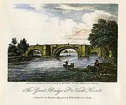 In 1588, a new town bridge was built. A survey of the old bridge showed that it consisted of 72 arches, and it was 704 feet in length and 7 ft 6 in wide. The replacement bridge was to have masonry piers up to the flood water level. The river formed the boundary between Bedfordshire and Huntingdonshire, so both counties had to contribute to the costs of materials and labour.[28]