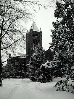 In 1867 the state established a university for the purpose of fostering access to higher education for the working people.[5] After a bidding war between several cities, Urbana was selected in 1867 as the site for the new school.[3] From the beginning, Gregory's desire to establish an institution firmly grounded in the liberal arts tradition, which was at odds with many State residents and lawmakers who wanted the university to offer classes based solely around "industrial education"[6] The university opened for classes on March 2, 1868, with two faculty members and 77 students.[7] This same year the College of Agriculture, Consumer, and Environmental Sciences and the College of Fine and Applied Arts (Then called the College of Literary Science) were established. This was then followed by The College of Engineering in 1868. The debate between the liberal arts curriculum and industrial education continued in the university's inaugural address, as Dr. Newton Bateman outlined the various interpretations of the Morrill Act in his speech.[8] Gregory's thirteen-year tenure would be marred by this debate. Clashes between Gregory and legislators and lawmakers forced his resignation from his post as president in 1880, saying "[I am] staggering under too heavy a load of cares, and irritated by what has sometimes seemed as needless opposition."[4] Nevertheless, Gregory is largely credited with establishing the university as it is today. Gregory's grave is on the Urbana campus, between Altgeld Hall and the Henry Administration Building. His headstone (mimicking the epitaph of British architect Christopher Wren) reads, "If you seek his monument, look about you."