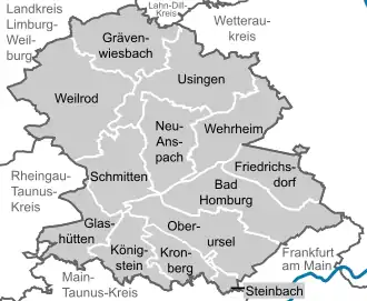 The Hochtaunuskreis is a Kreis (district) in the middle of Hesse, Germany and is part of the Frankfurt/Rhine-Main Metropolitan Region. Neighbouring districts are Lahn-Dill, Wetteraukreis, district-free Frankfurt, Main-Taunus-Kreis, Rheingau-Taunus-Kreis, Limburg-Weilburg.