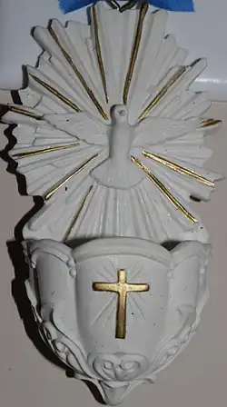 The small bowl contains holy water so that the house's inhabitants could cross themselves in the morning and make the sign of the cross over their beds at night.[4]