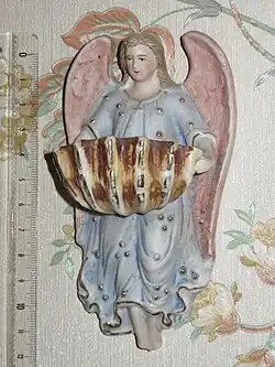 The use of these stoups began in the earliest centuries of the Christian Church. They were made of both expensive (gold, silver, etc.) and cheap (faience, ceramic, wood) materials; dependent on the fortunes of their owners. They were handmade with a painting or relief of Jesus, the Cross, the Virgin Mary, an angel or other religious subjects.[4]