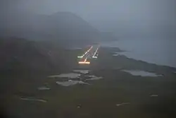 Honningsvåg Airport, Valan (Norwegian: Honningsvåg lufthavn, Valan; IATA: HVG, ICAO: ENHV) is a regional airport serving Honningsvåg in Nordkapp Municipality, Norway. The airport is located at Valan, on the south side of Skipsfjorden, 4 kilometers (2+12 miles) north of the town, and 31 km (19+12 mi) from the North Cape. The airport has a 880-by-30-meter (2,887 by 98 ft) asphalt runway which is operated by the state-owned Avinor. Flights are operated by Widerøe to Tromsø with connecting flights to Oslo. The airline also flies to other communities within Finnmark, serving the airport with Dash 8-100 and Q200 aircraft. The airport handled 13,487 passengers in 2014.