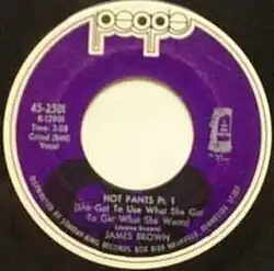 "Hot Pants (She Got to Use What She Got to Get What She Wants)" is a 1971 song by American singer James Brown, released as a single on his People Records label (then distributed by King Records) in July of that year with "Pt. 1" on the A-side and "Pt. 2 and 3" on the B-side. It was a number-one hit on the Billboard R&B chart, and reached number fifteen on the Hot 100[1] and number ten on the Cashbox[2] magazine charts.[3][4] "Hot Pants" was Brown's final release under King's purview before he and the People label moved to Polydor Records.