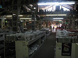 At first sight, the music store appears as more of a rummage sale, with nearly everything arranged in a state of disarray, however, simply asking an employee for help is an option, as most employees know where everything is. In addition to music on CD, cassette and vinyl records, the store also sells videos, T-shirts, magazines, posters, music books and thousands of other rock memorabilia items. The angled ceilings are covered with signed photographs, posters, and drum pads, while the walls are covered in sharpie signatures from musicians who have visited in the past.