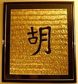 Hu (胡) is a Chinese surname. In 2006, it was the 15th most common surname in China.[1][2] In 2013, it was the 13th most common in China, with 13.7 million Chinese sharing this surname.[3] In 2019, Hu dropped to 15th most common surname in mainland China.[4]