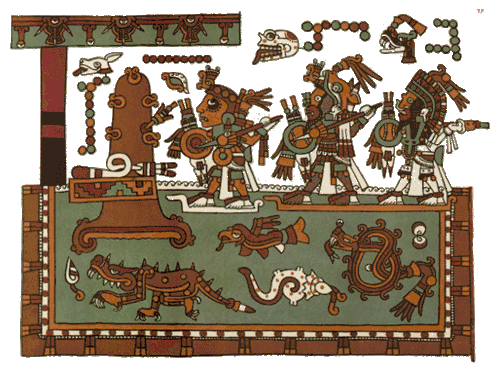 An example of the pictorial representations the Mixtecs used for non-verbal communication through writing. Here, in this picture, which is a reproduction of a work from the Codex Zouche-Nuttall, a village is being sacked by some warriors.