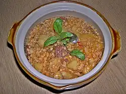Lecsó A mixed vegetable stew, made of primarily tomato and Hungarian wax paprika, also found throughout the Balkans and Central Europe. It is somewhat similar to ratatouille, but without squash and zucchini. A variety exists called tojásos lecsó (lecsó with eggs), which has scrambled eggs mixed in. Other popular variant is rizses lecsó (lecsó with rice), which is made with cooked rice and often a bit of potato as well. Lecsós hús is roasted meat served with lecsó stew, often served with rice or tarhonya.