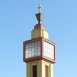 The design of the tower was a collaboration with Pavel Janák who designed the other nearby Hussite church in Vinohrady.[4] It is topped at 33 metres (108 ft) by a chalice which is a key symbol of the Hussite church as well as a cross.[3] There is an extended floor near the top of the tower which is surrounded by the four large glass panels. The design for the tower has four tall thin shuttered windows. The tower was intended to be seen as a "ship's lantern" which symbolises a "lighthouse" pointing the way to eternity.[5]