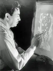 In 1939, Velonis, Warsager and other artists co-founded the Creative Printmakers Group in New York City.[20][21] About this group, Sylvie Covey wrote in Modern Printmaking: A Guide to Traditional and Digital Techniques: "The group's shared screen-printing studio introduced the silkscreen process to many serious artists who went there to have editions printed. Vincent Longo worked as a colorist at Creative Printmakers Group, as did Jackson Pollock, and the print shop eventually became the most important silkscreen shop of the era. It was at about this time that the word serigraphy, which combines the Latin word seri ("silk") and the Greek word grapho ("to write"), first appeared. It was coined by Carl Zigrosser … to distinguish fine-art from commercial silkscreen"".[18]