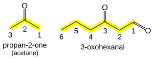 In general ketones (R2C=O) take the suffix "-one" (pronounced own, not won) with a suffixed position number: CH3CH2CH2COCH3 is pentan-2-one. If a higher precedence suffix is in use, the prefix "oxo-" is used: CH3CH2CH2COCH2CHO is 3-oxohexanal.