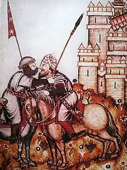 Two warriors embrace before the siege of Chincoya Castle (Cantigas de Santa Maria).