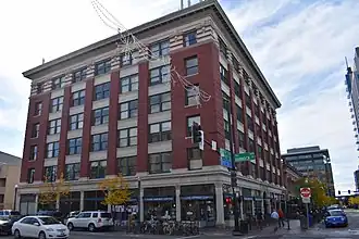 The Idaho Building in Boise, Idaho, is a 6-story, Second Renaissance Revival commercial structure designed by Chicago architect, Henry John Schlacks.[2] (The National Register of Historic Places Inventory/Nomination Form lists Tourtellotte and Hummel as building designers, but "Tourtellotte may have been only a supervising architect...[3]) Constructed for Boise City real estate developer Walter E. Pierce in 1910–11, the building represented local aspirations that Boise City would become another Chicago. The facade features brick pilasters above a ground floor stone base, separated by seven bays with large plate glass windows in each bay. Terracotta separates the floors, with ornamentation at the sixth floor below a denticulated cornice of galvanized iron.[4]