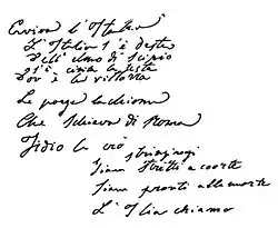 Novaro's autographed manuscript to the publisher Francesco Lucca is located in the Ricordi Historical Archive.[24] The later Istituto Mazziniano sheet lacks the final strophe ("Son giunchi che piegano...") for fear of censorship. These leaflets were to be distributed at the 10 December demonstration in Genoa.[25] The hymn was also printed on leaflets in Genoa, by the printer Casamara.