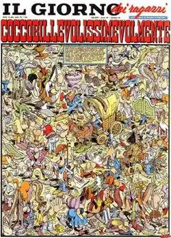 The comic magazine debuted on 28 March 1957. It was originally intended as the Italian version of the British children's periodical Eagle, of which it published several series such as Dan Dare, Pilot of the Future, Storm Nelson and Frank Humphris' Riders of the Range. It also presented a significant Italian production, mainly of humorous genre, which included Benito Jacovitti's Cocco Bill, Gionni Galassia and Tom Ficcanaso, Bruno Bozzetto's comic versions of West and Soda and VIP my Brother Superman, Giovanni Manca's Pier Cloruro de' Lambicchi, Poldo e Poldino by Andrea Lavezzolo and Giuseppe Perego, I Naufraghi by Pier Carpi and Sergio Zaniboni.[1][2]