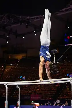 Kovtun competed at the World Cups in Cairo, Cottbus, and Baku; he won gold on the parallel bars at each competition.[33][34][35] He next competed at the Osijek Challenge Cup where he won gold on floor exercise and silver on parallel bars behind Lukas Dauser.[36] In late April Kovtun competed at the European Championships alongside Nazar Chepurnyi, Igor Radivilov, Radomyr Stelmakh, and Oleg Verniaiev; together they qualified to the team final in first place and individually Kovtun qualified to the parallel bars and horizontal bars finals. Additionally Kovtun finished sixth in the all-around. During event finals Kovtun won gold on both apparatuses.[37] During the team final Kovtun contributed scores on pommel horse, rings, parallel bars, and horizontal bar towards Ukraine's first place finish.[38]