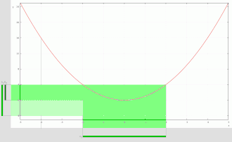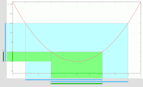 Image showing non-equal sets: The sets and are shown in blue immediately below the -axis while their intersection is shown in green.